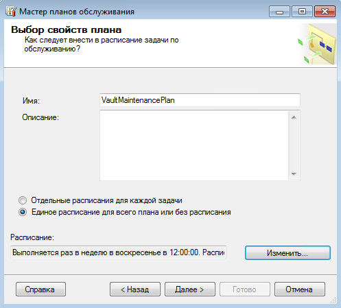 - В диалоговом окне "Выбор свойств плана" в качестве имени введите "План обслуживания хранилища" и нажмите кнопку "Изменить", чтобы настроить расписание.