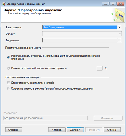 - В диалоговом окне "Определение задачи перестроения индексов" выберите "Все пользовательские базы данных" из раскрывающегося списка.