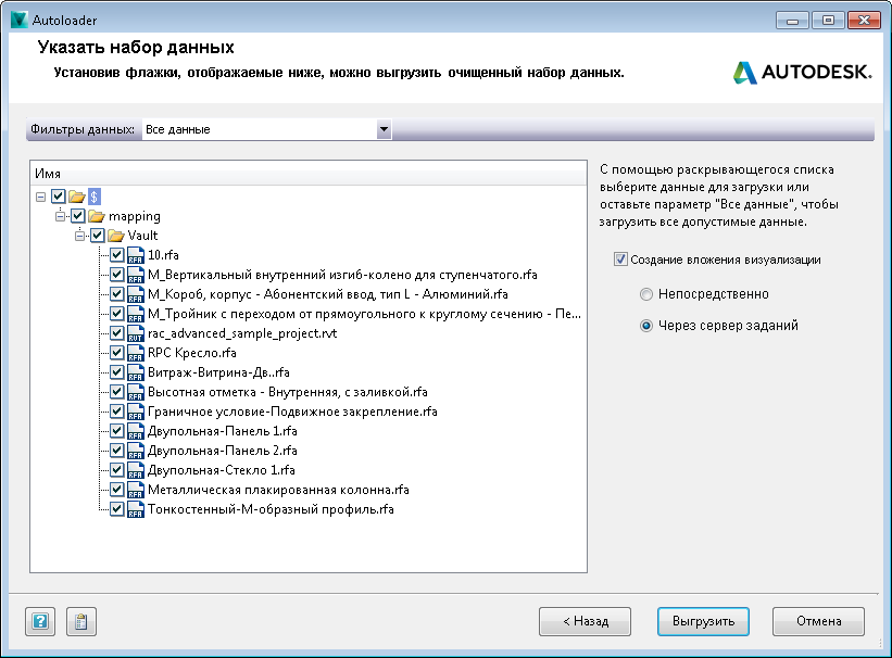 Для использования сервера заданий в инструменте Autoloader выберите параметр "Создать вложение визуализации", затем выберите переключатель "Через сервер заданий" на экране "Указать набор данных".