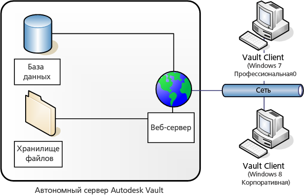 Сервер Vault состоит из трех компонентов: веб-сервера, базы данных и хранилища файлов. На следующем рисунке показана стандартная конфигурация компонентов.