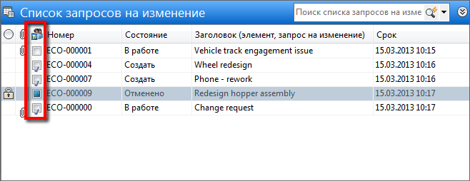 Это особое свойство, которое показывает состояние элементов, связанных с запросами на изменение. Состояние отображается на главной панели "Список запросов на изменение" и может иметь одно из трех значений: