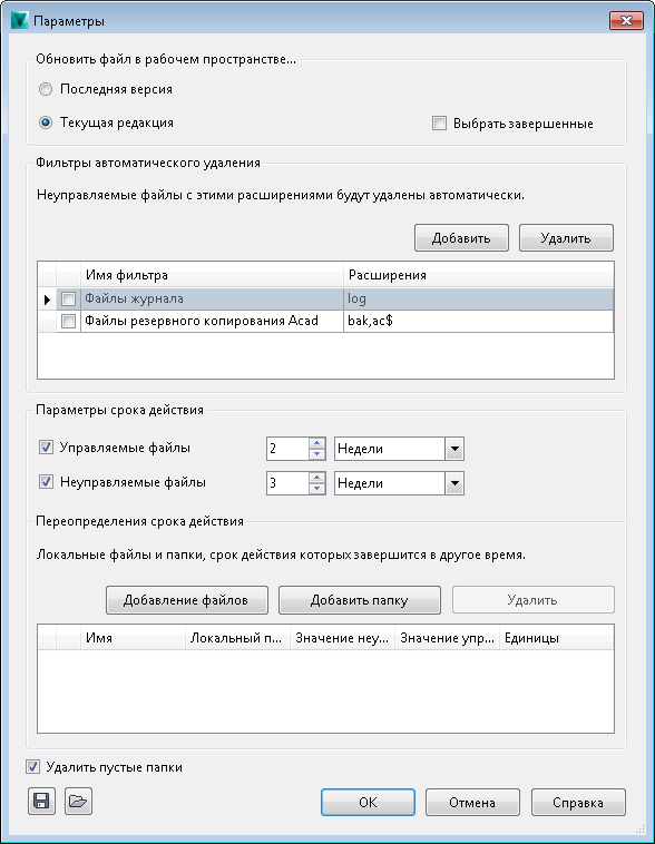 Пользователь может указать не управляемые с помощью хранилища типы файлов, которые автоматически удаляются из рабочего пространства. Файлы в рабочей папке, расширение которых совпадает с указанным, будут удалены при синхронизации. В программе существует два фильтра, отключенные по умолчанию: "Файлы журналов (.log)" и "Файлы резервных копий Acad (.bak, ac$)".