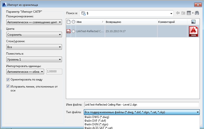 Можно выбрать файл в хранилище, чтобы импортировать его в текущий проект Revit. Можно также задать параметры положения для импортированного файла в диалоговом окне "Импорт из хранилища".