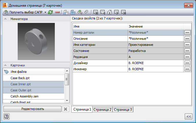 Прим.: При выборе нескольких деталей в списке браузера на полотне САПР выбираются соответствующие детали, но карточка данных не обновляется. Подробные сведения об обновлении нескольких карточек данных см. в разделе "Работа с наборами карточек".