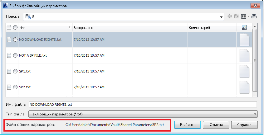 Совет: Autodesk рекомендует создать папку общих параметров в хранилище. Поскольку при поиске файла в хранилище пользователь может наткнуться на множество типов файлов в формате TXT, папка файлов общих параметров упрощает задачу поиска таких файлов.