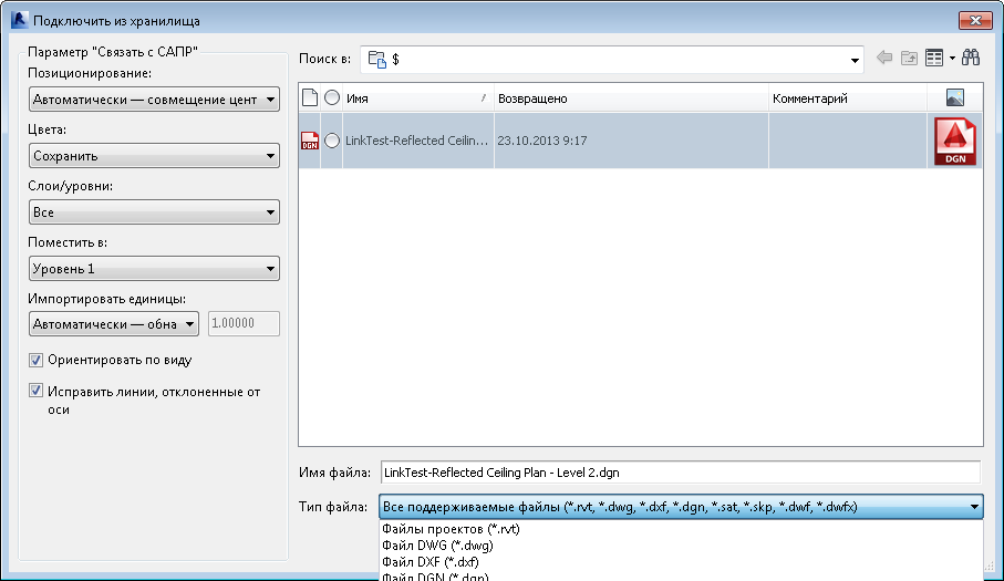 Можно выбрать настройки позиционирования при связывании файла с текущим проектом Revit.