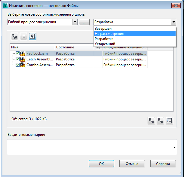 Команда "Изменить состояние" позволяет изменить состояние жизненного цикла для файлов, папок, элементов и пользовательских объектов. Изменение состояния жизненного цикла объекта Vault устанавливает определенное поведение жизненного цикла, настроенное администратором Vault. Возможны следующие состояния: "Разработка", "Завершено" и "Устарело".