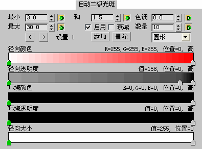 定义自动二级光斑沿其进行分布的轴的总长度。如果增大该值,光斑之间的空间会增大,如果减小该值,光斑之间的空间会减小。轴可以设置为 0 度到 5 度。可以对此参数设置动画。