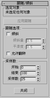 “跟随/倾斜”工具对运动轨迹上已存在的对象应用旋转关键点。其中的设置与“路径”约束中的设置相似。如果已经为一个对象指定了运动,并希望它跟随或沿其轨迹倾斜,但又不希望使用“路径”约束,请使用此工具。