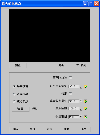 警告: 设置“镜头效果”参数的动画时,会在实际场景中创建指针,所以如果将“Video Post”队列保存在