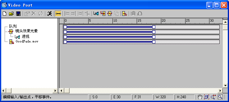 该队列再次显示所有正确的事件,但是此处的问题却出在队列中的事件顺序上。在添加其他事件的同时某个事件处于选定状态,此时通常导致该问题出现。在本例中,选定“透视”事件的同时,正在添加“镜头效果光晕”事件和输出事件。