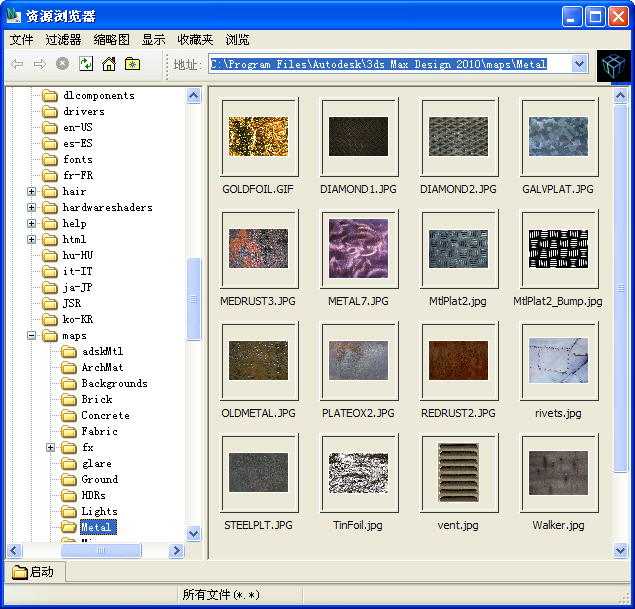 显示所有存储在缓存目录中的缩略图。启用该选项时,显示目录树的左边窗格会消失,而且所看到的缩略图可能在多个目录中。因为缩略图指向正确的目录,所以仍然可以使用它们来访问文件并显示或将它们拖动到 3ds Max 用户界面中的区域。