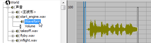 第一、第二和第四个声音轨迹以单声道方式录制,因此显示为单个波形。第三个声音轨迹 flyby.wav 以立体声方式录制,显示为两个波形,一个表示左声道,另一个表示右声道。
