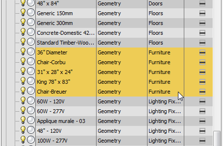 - 选择列表中的第一个家具对象,按住 Shift 键,然后选择最后一个家具对象,这样就可以选中两者及两者之间的所有家具对象。
