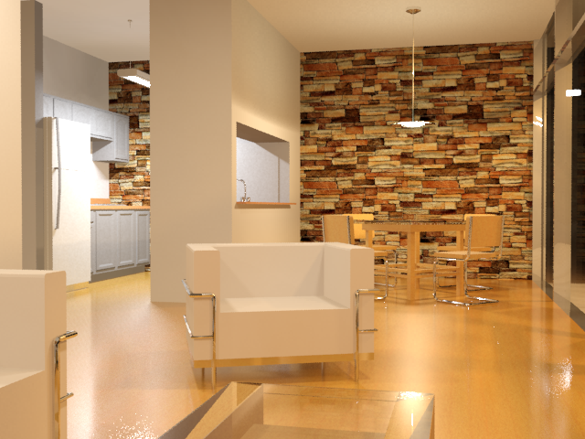 渲染结果显示,当大部分光源非常理想地照亮内部时,厨房灯光过于明亮,从而掩盖了橱柜和器具的细节。但是并不需要返回并调整 Revit 中灯光的强度,您可以使用 3ds Max 中的控件来完成相同的任务。