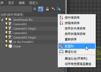 - 在“场景资源管理器”面板中,右键单击列标题,然后从下拉菜单中选择“配置列”。
