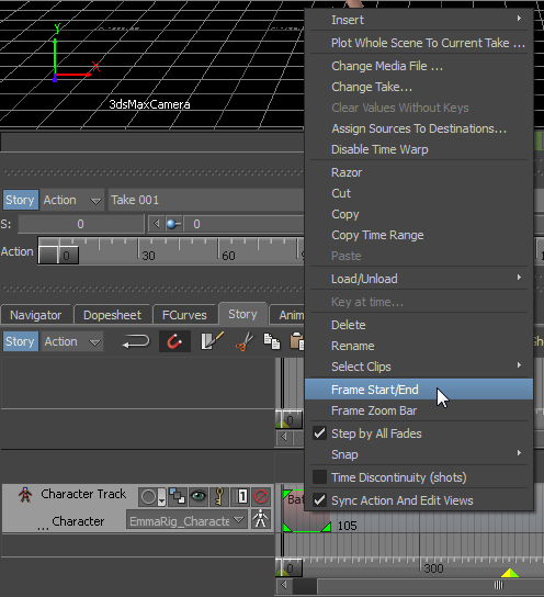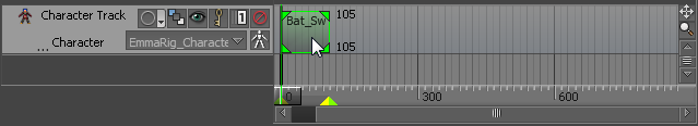 时间轴上显示的内容指明 Bat_Swing 剪辑有 105 帧,但 MotionBuilder 中的默认动画长度有 500 帧。要解决此问题,请右键单击剪辑,然后从弹出菜单中选择“开始/结束帧”。
