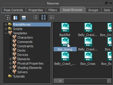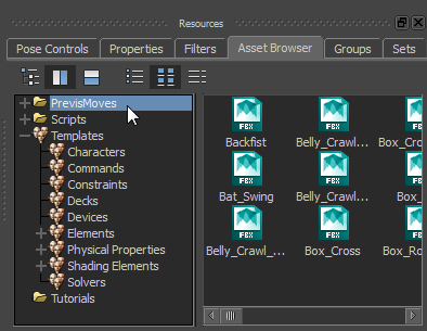 在“资源”窗口 “资源浏览器”选项卡(在“MotionBuilder”窗口的右下角)中,单击以高亮显示 PrevisMoves 文件夹。