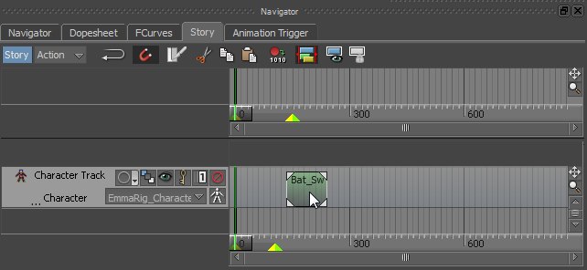 在 PrevisMoves 文件夹中,找到 Bat_Swing 运动剪辑,然后将其拖动到“故事”选项卡,并将其放置在两个时间轴中的下面一个。 首先,高亮显示 Bat_Swing 剪辑。
