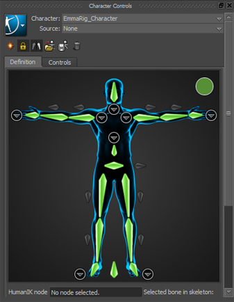 “定义”显示应显示“绿色灯光”,表明已成功通过“发送到”操作将 Emma 的 CAT 装备映射到 MotionBuilder。