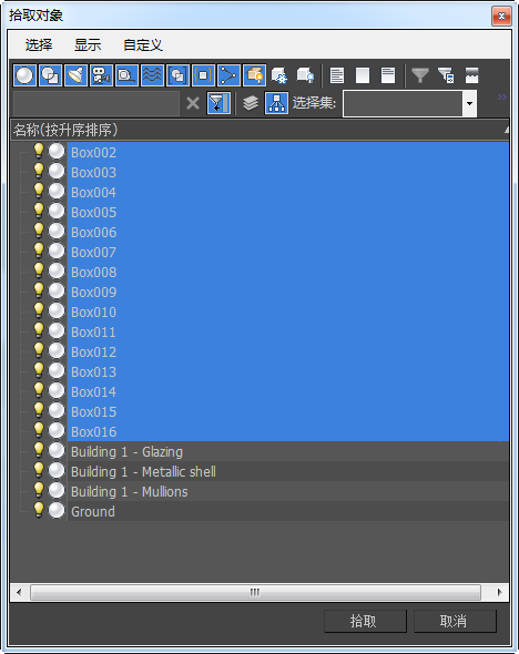 - 按 H 键打开“拾取对象”对话框。在列表中,选择全部长方体对象,然后单击“拾取”。