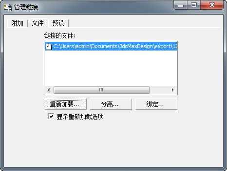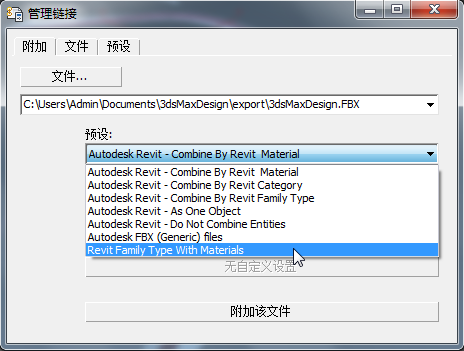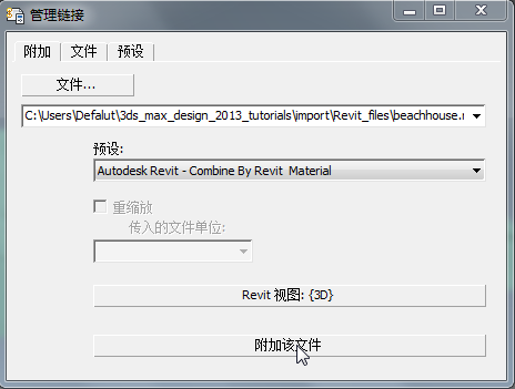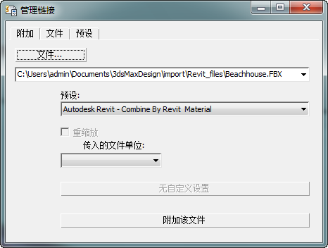 已链接到 3ds Max 场景。在 Revit 中执行完场景的更改后,您还会用到此选项卡;但此时您已完成“文件链接管理器”的部分。