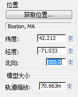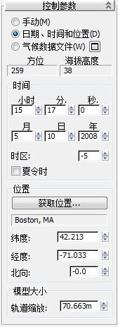 “运动”面板。在“控制参数”卷展栏中,留意其中的设置。 “位置”已正确设置为“Boston”,并且“时间”组