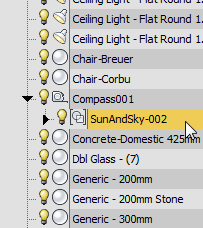 SunAndSky-002 是 Compass001 的子对象。如果最初看不到 SunAndSky-002,请单击 Compass001 旁的箭头图标以查看 SunAndSky-002。此外,您可能必须增加“名称”列的宽度才能查看对象名称。