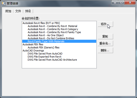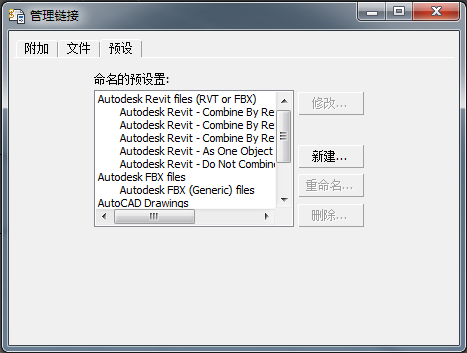 “预设”选项卡中列出若干个可用于链接 RVT、FBX 或 DWG 文件的预设。在“附加”主选项卡上,您可以选择来自“预设”下拉列表的预设。可以使用“预设”选项卡编辑预设,或添加新的预设。