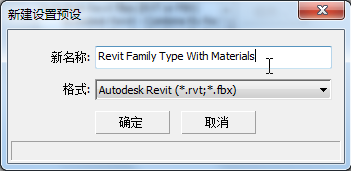 - 在出现的“新建设置预设”对话框中,将新预设命名为 Revit Family Type With Materials,然后单击“确定”。
