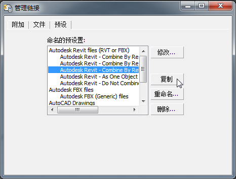 - 在“预设”选项卡中,单击以高亮显示条目“Autodesk Revit - 按 Revit 系列类型合并”,然后单击“复制”。