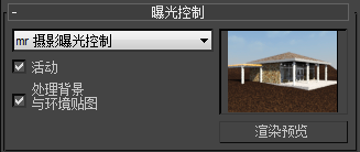 - 在“曝光控制”卷展栏中,确保已启用“活动”,然后单击“渲染预览”按钮以快速检查曝光预设将如何影响场景。