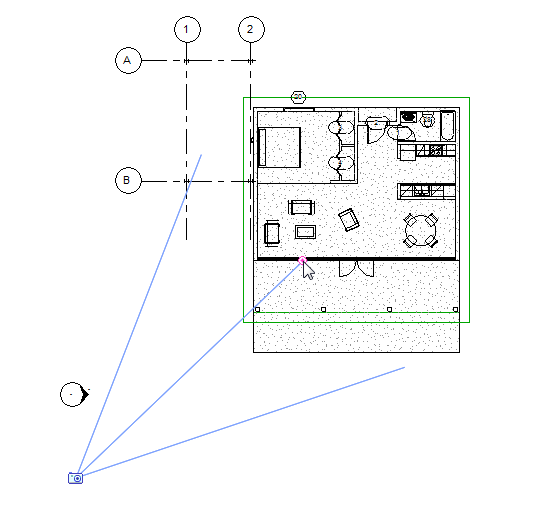 Revit 将创建一个摄影机视图。这是最初要用来在 3ds Max 中渲染图像的视图。它也会更改功能区,以显示“修改”|“摄影机”选项卡。