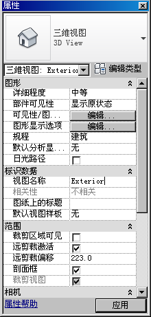 “视图名称”字段中,将摄影机名称更改为 Exterior,然后单击“应用”(或按 Enter 键)。