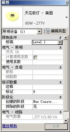 Revit 将在左侧的“属性”面板中显示该灯光对象的说明。