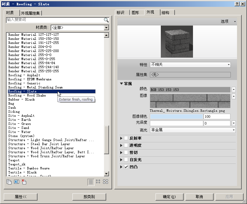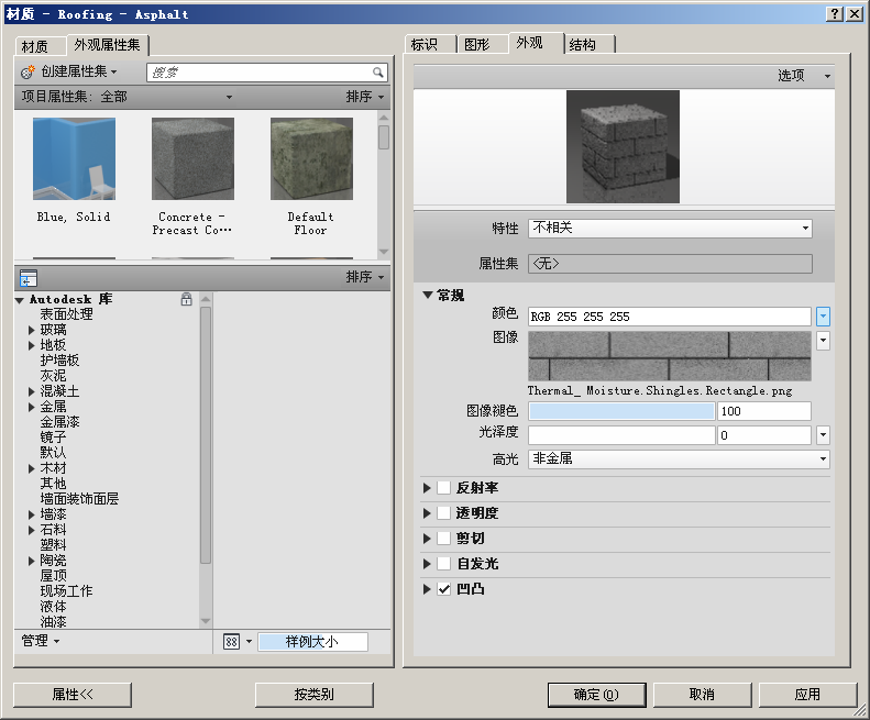 “材质”列中,单击列表顶部的项“屋顶 - 沥青”。