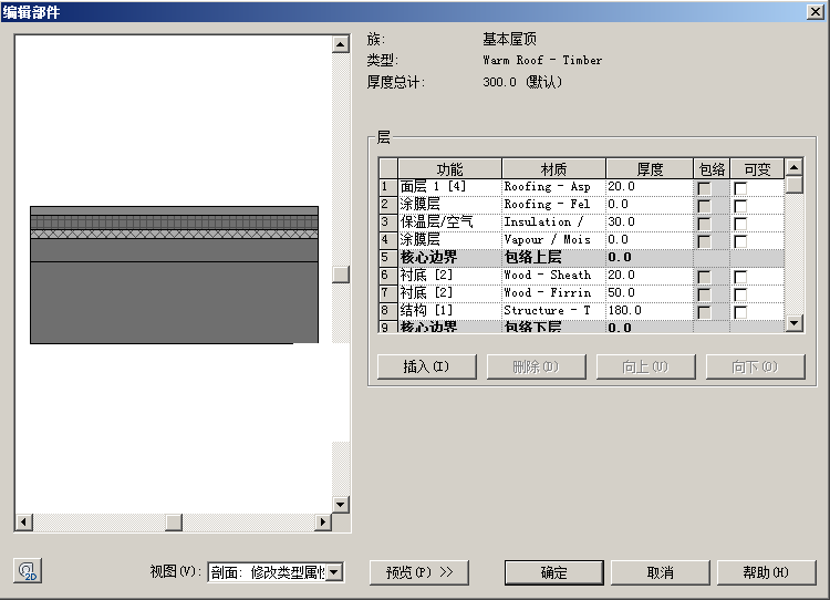 Revit 在其左侧显示一面板,其中显示屋顶横截面的详细信息。