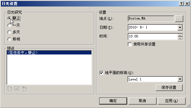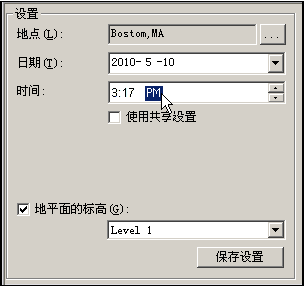 Revit 将打开“日光设置”对话框,从中您可以为日光系统创建的太阳位置设置地理位置和时间。