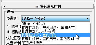 3. 在“mr 摄影曝光控制”卷展栏上,打开“预设”下拉菜单并选择“物理性灯光、室内日光”。