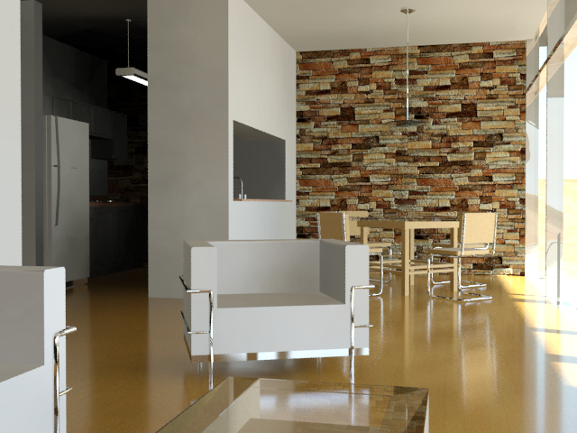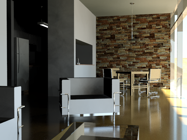 在最近一次渲染中,注意现在可以在厨房餐桌与橱柜上看到的细节。另外,整个场景的颜色呈现出由“Sky 入口”生成的天光的蓝色色调。