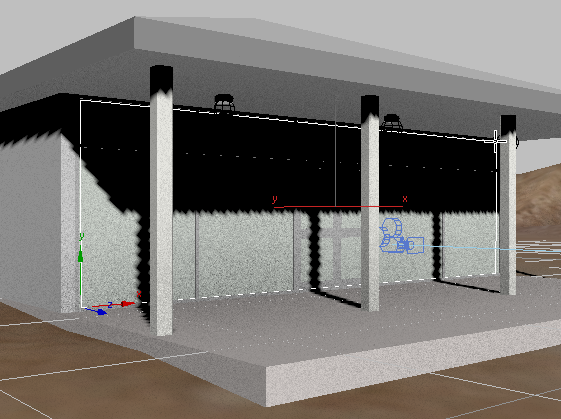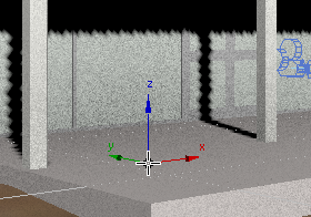 4. 将鼠标定位到平房中装有窗帘的窗口的右下角(该对象名称为“玻璃”),确保 Z 轴指示器与曲面垂直。