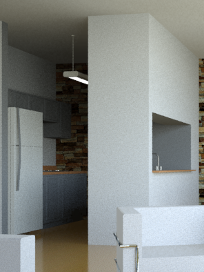 现在,厨房照明设备很暗,渲染的颗粒性有所减少。