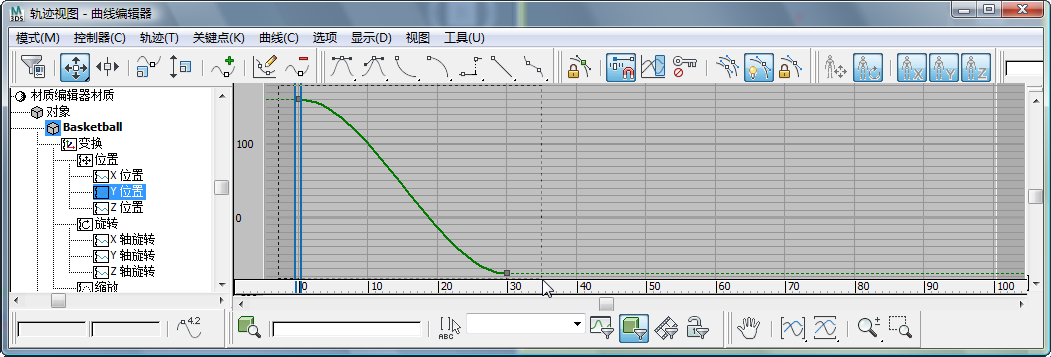 3ds Max 将打开“曲线编辑器”。刚刚创建的球轨迹会显示在左侧,而曲线本身会显示在右侧的曲线窗口中。
