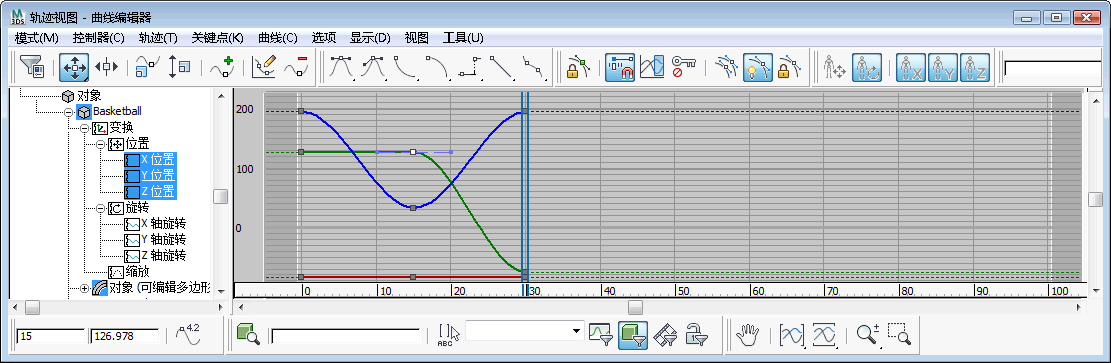 “控制器”窗口(左侧的对象和轨迹的列表)中,单击“Z 位置”轨迹以显示该轨迹的曲线。