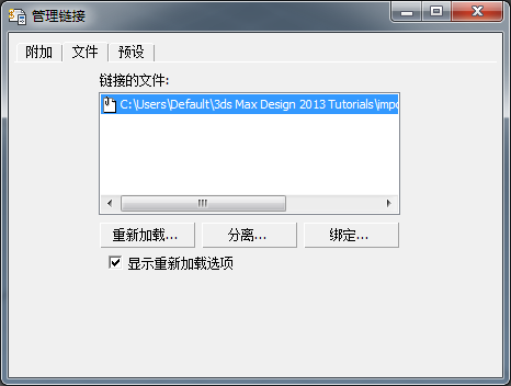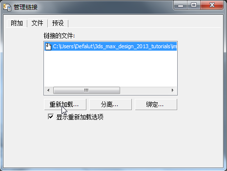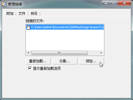 1. 在“文件链接管理器”对话框 “文件”面板上,单击“绑定”。