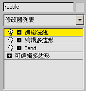 选择 reptile 模型,并查看修改器堆栈,您可以看到再次从 Mudbox 导入后在堆栈中添加了两个修改器:“编辑法线”修改器和“编辑多边形”修改器。