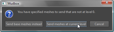 Mudbox 将显示一条消息,指明您正在发送不在基础层级上的网格。单击“Send Meshes At Current Level”。