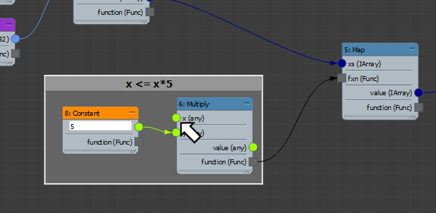 输入或操作符节点的函数输出会将输入节点、操作符节点以及该节点左侧的所有图形视为函数。该图形中未连接的输入节点将成为函数的参数。