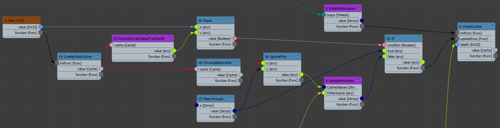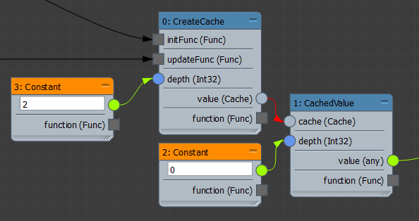 CreateCache 节点的 initFunc 是一个用于设置缓存初始状态的函数。例如,对于变形修改器,这通常就是网格的顶点位置(来自 MeshVertices 节点)。