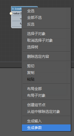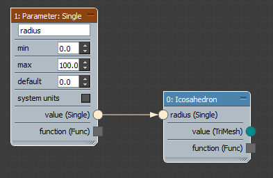 参数:编辑器窗口中会显示单个节点,其已关联到“二十面体”节点的输入连接器。这是一种非常方便的快捷方式,用于查找“参数: 单个”节点,将其拖动到窗口,然后手动关联到输入连接器。